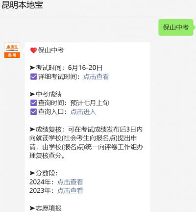 温馨提示:微信搜索公众号【昆明本地宝】,关注后在对话框回复【保山中考】可获2025年保山中考成绩公布时间+入口,录取分数线+分数段,普高+中职的志愿填报时间、填报入口,录取查询入口等;